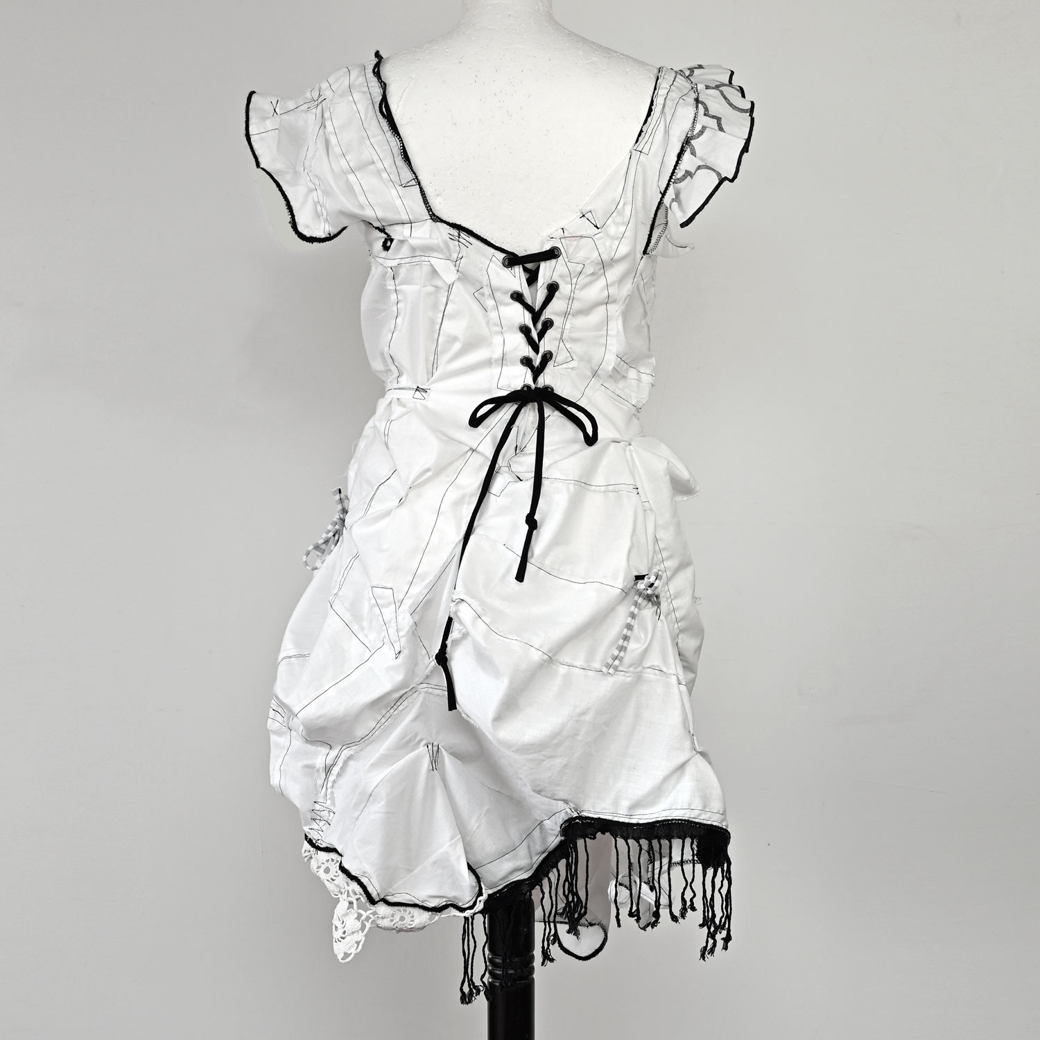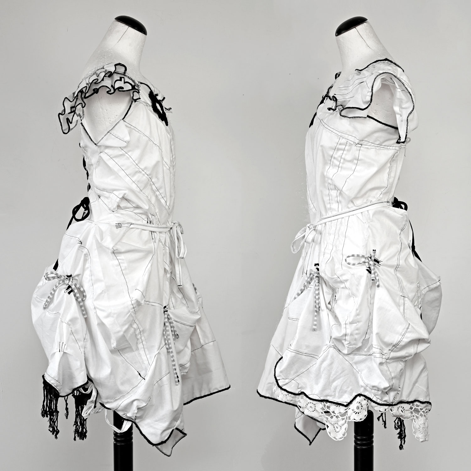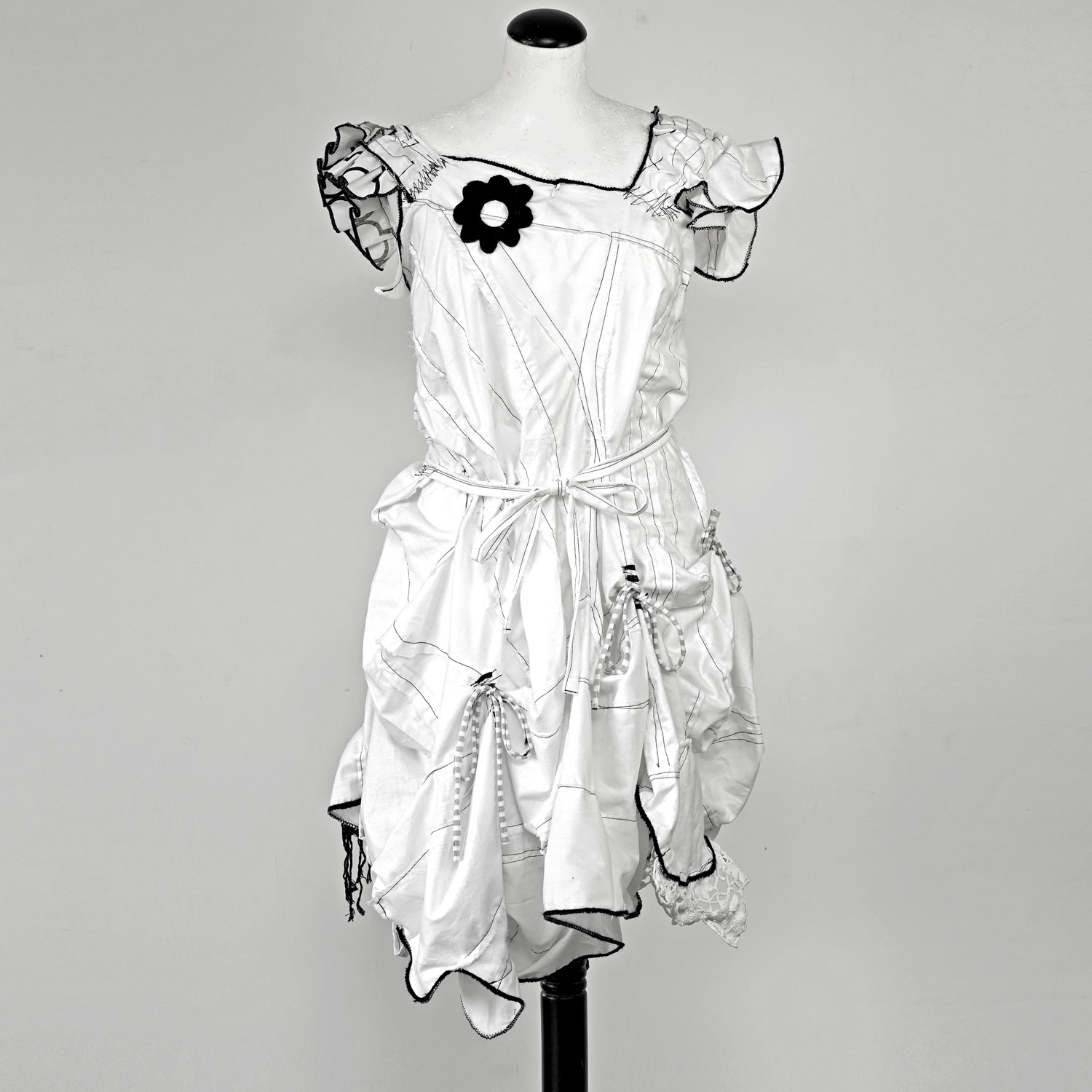Uzbudljiva bijela pamučna haljina sa crnim detaljima. Šivana je slobodnim stilom. Unatoč sirovom izgledu, svi šavovi su pomno dorađeni i maksimalno izdržljivi.