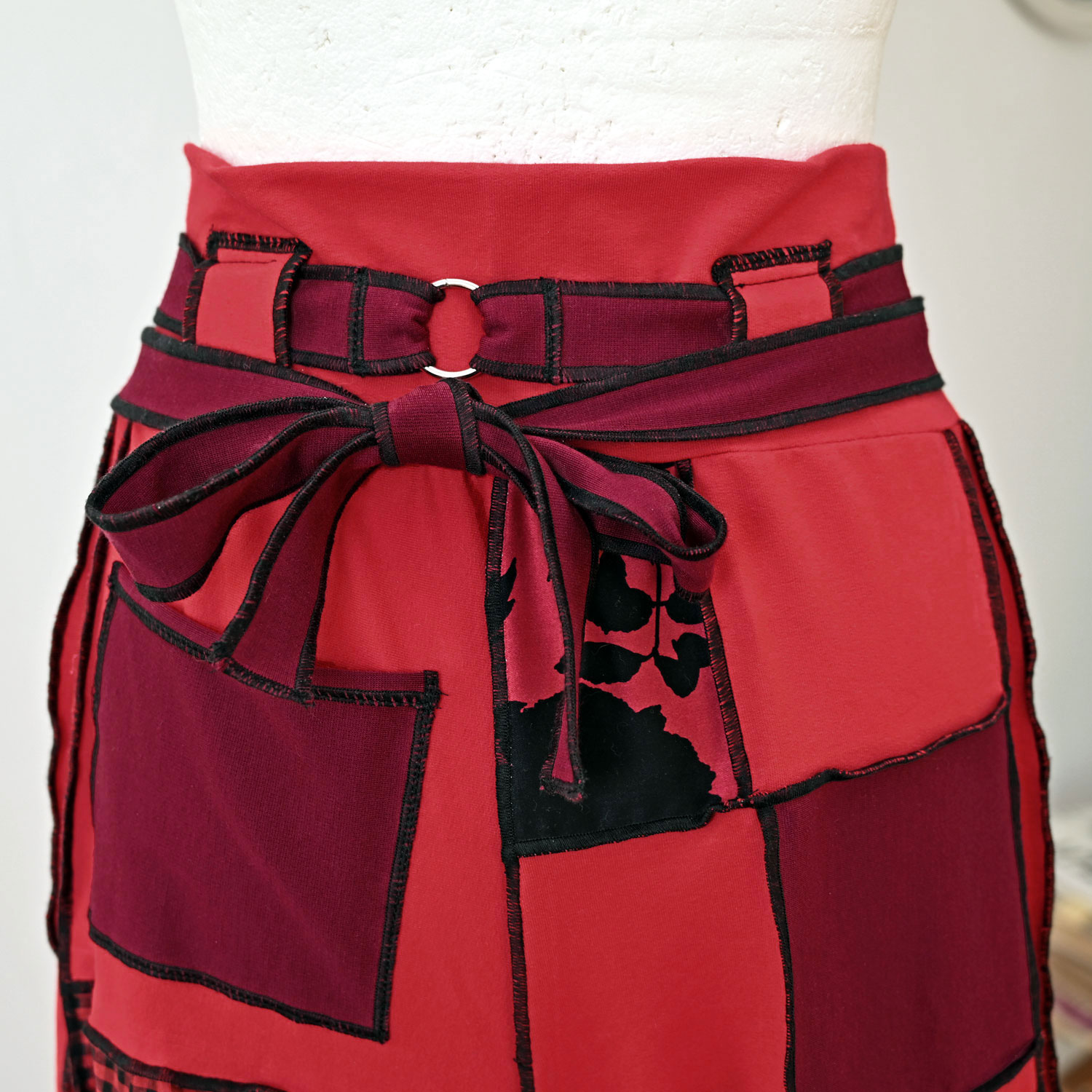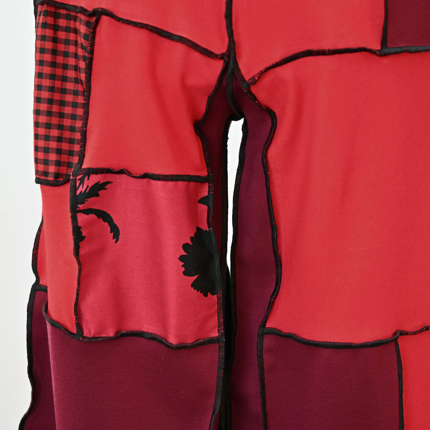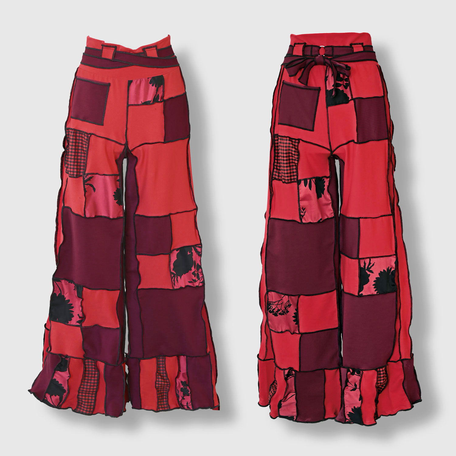 Hlače od različitih punijih žerseja i drugih crvenih i bordo tkanina. Mekane, elastične i udobne. S dugačkim pojasom koji se dvaput obavija oko struka.