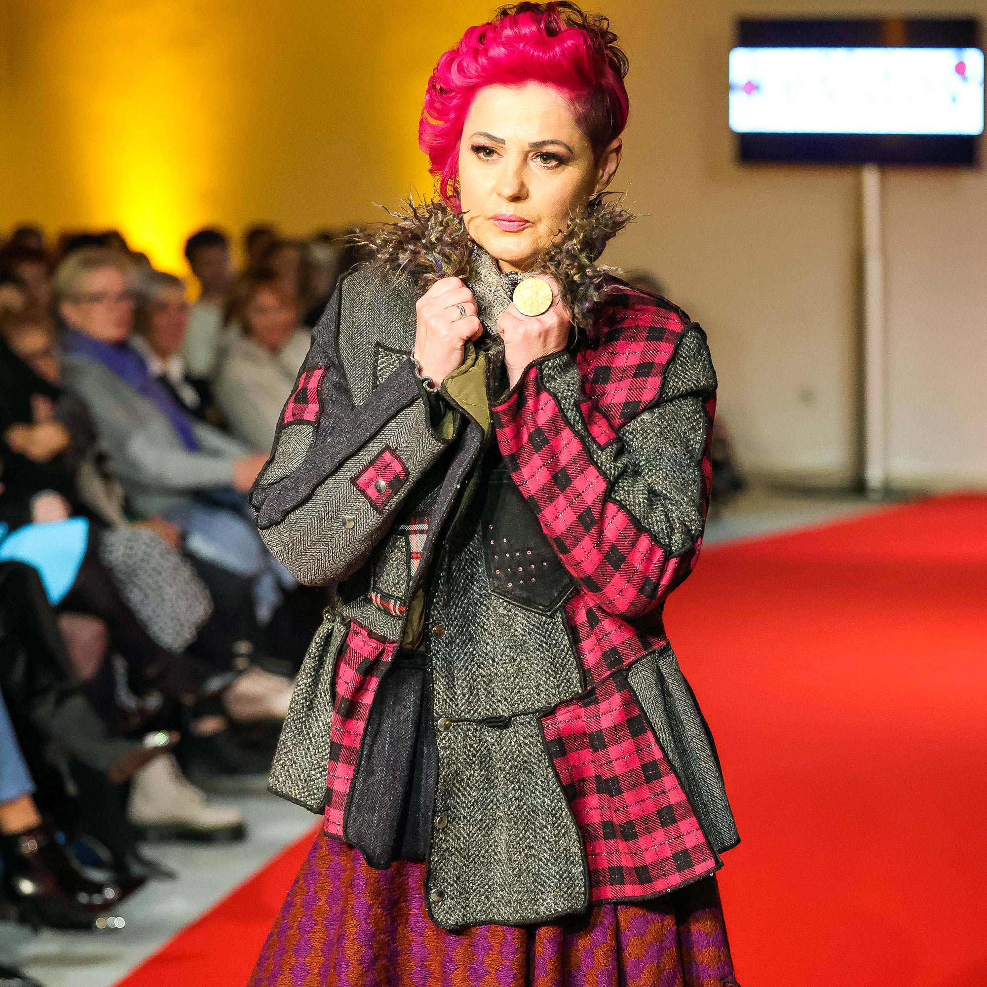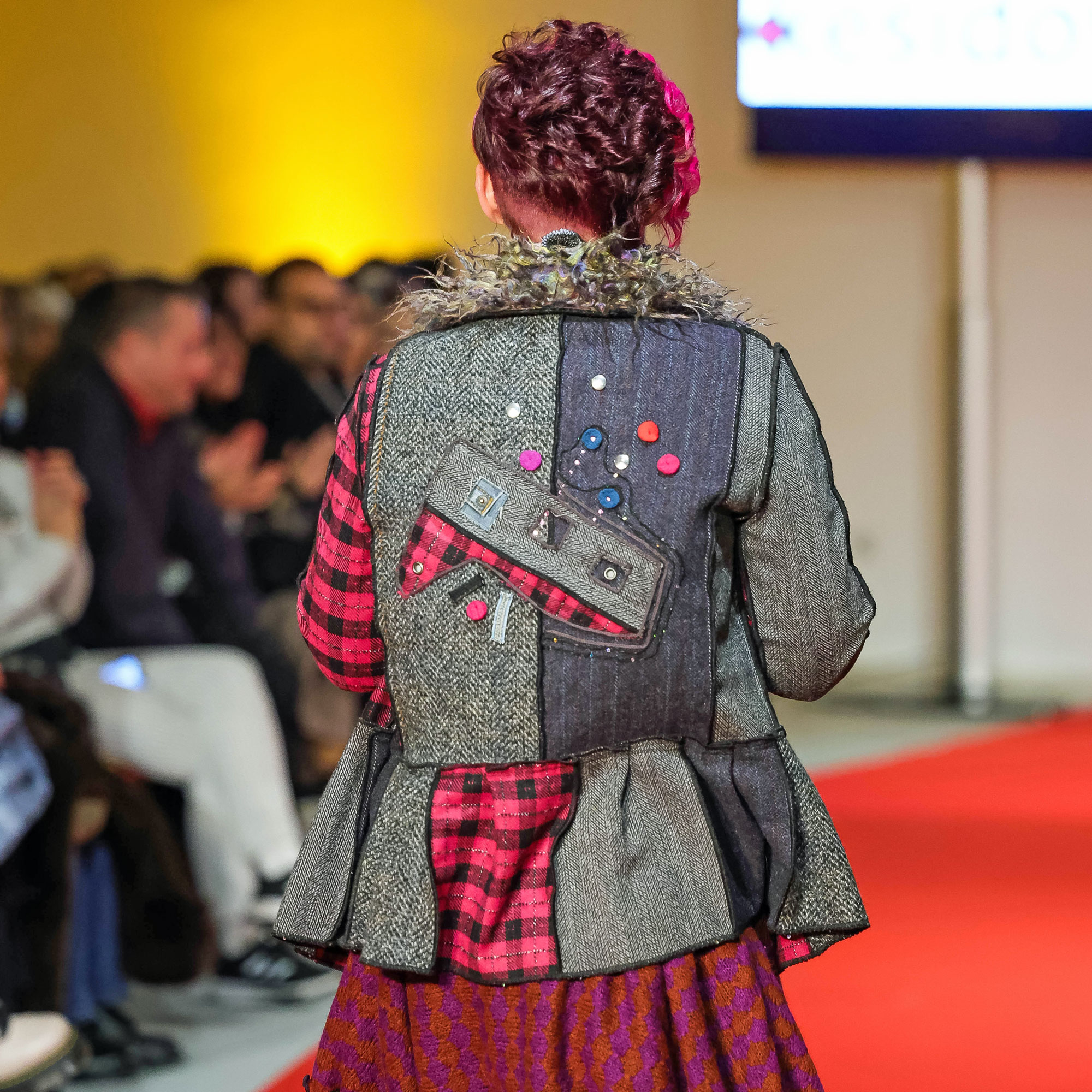 Jakna od različitih nadcikliranih vunenih štofova, s štepanom vatiranom podstavom. Širi model blago spuštenih ramena. Duljina jakne oko 68 cm, duljina rukava oko 63 cm. Una je veličina XS, a nosi jaknu S.br>Puna cijena 240€.