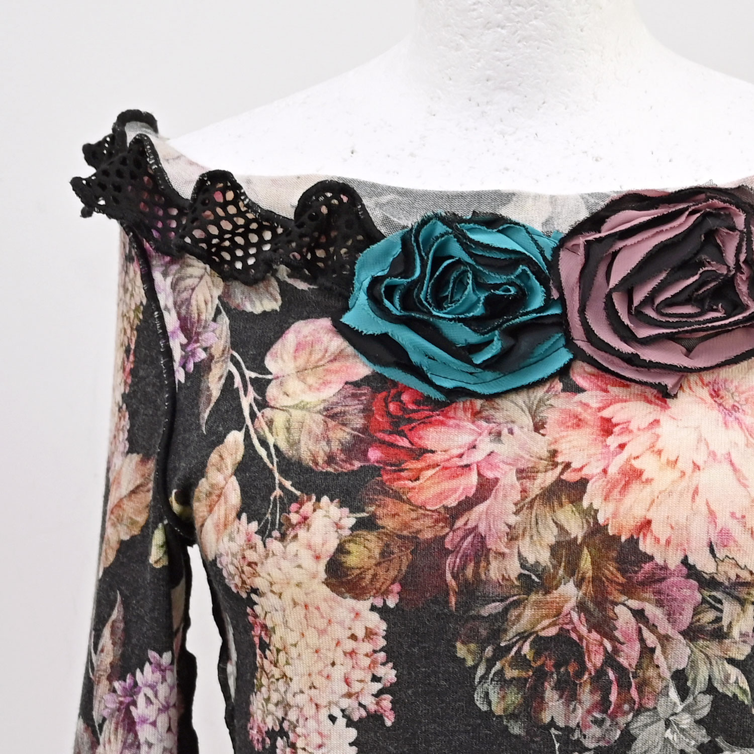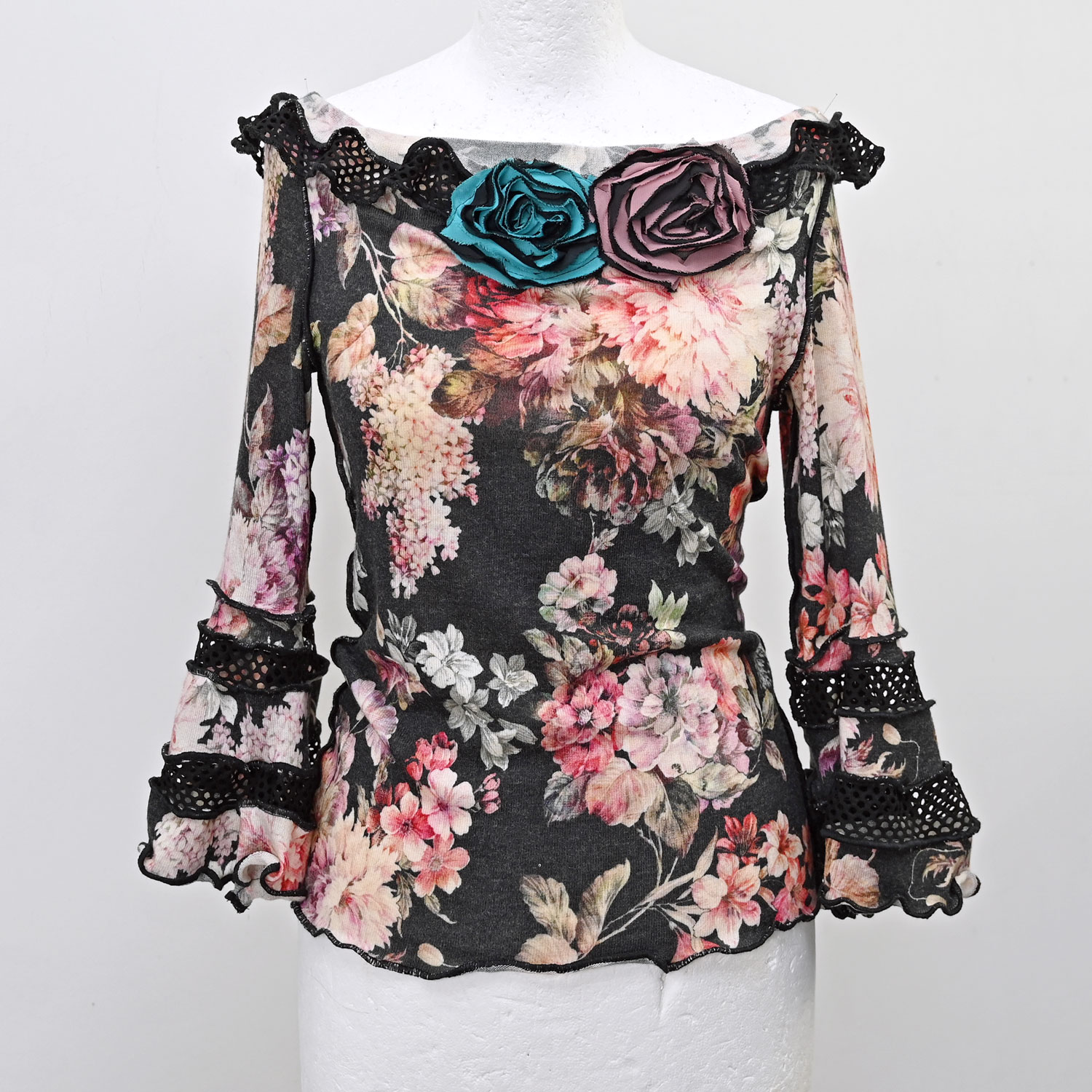 Lagana i mekana majica od elastičnog viskoznog žerseja, s pamučnom providnom mrežicom na rukavima i vratnom izrezu. Rukavi tri-četvrt. Vratni izrez širok, može se spustiti na ramena. Duljina majice oko 58 cm.