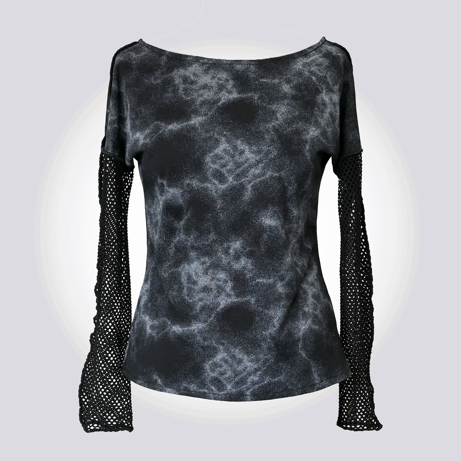 Pamučna majica s rukavima od pamučne providne mrežice s elastinom. Dugačka oko 56 cm.
