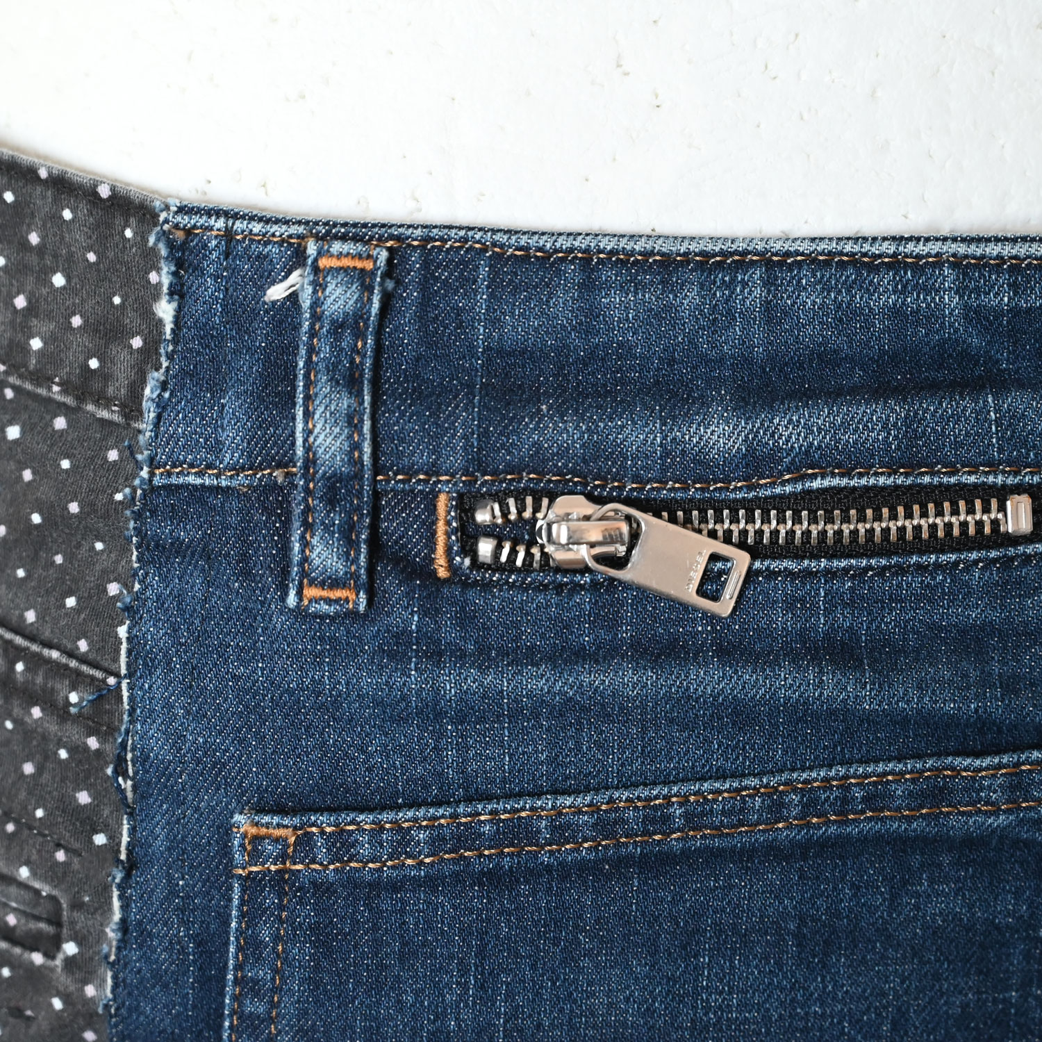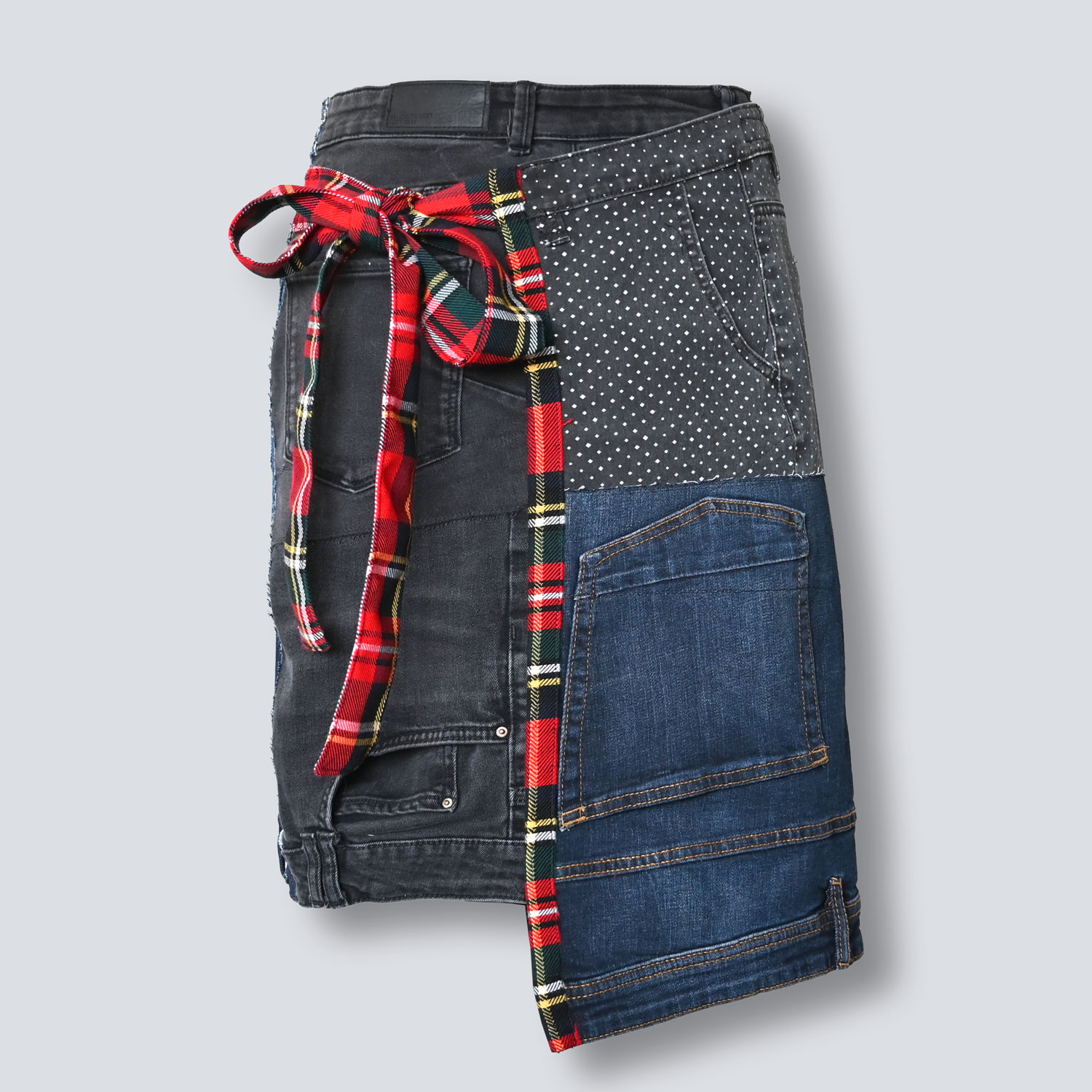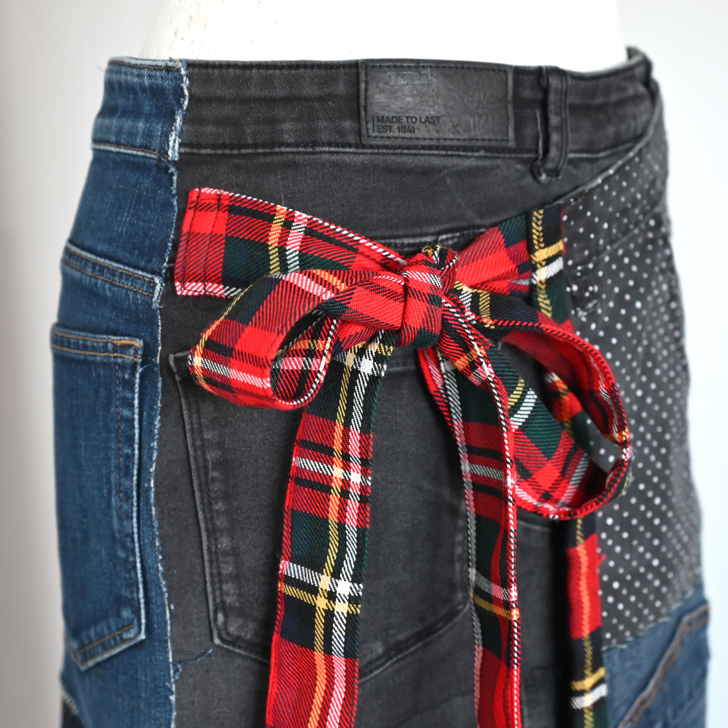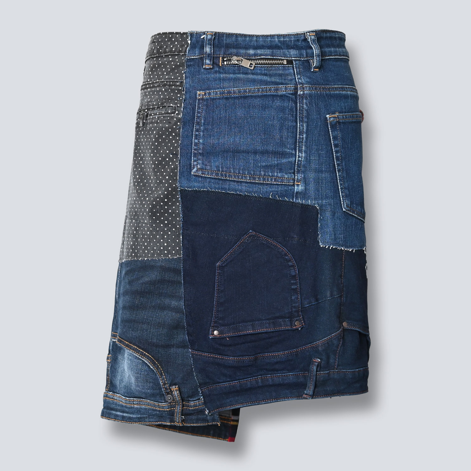 Nadciklirana džins suknja na preklop s funkcionalnim džepovima. Dvobroj. Širina suknje se podešava čičak-trakom iznutra i vezivanjem s vanjske strane. Duljina varira od 53 do 58 cm, sprijeda na preklopu je najdulja.