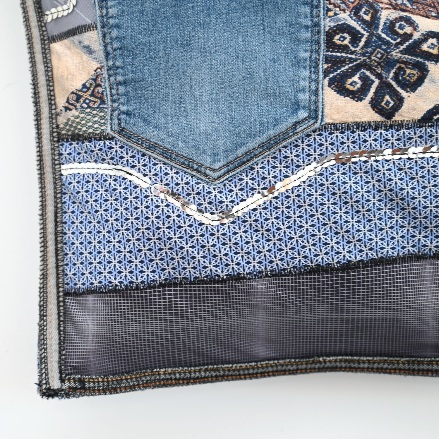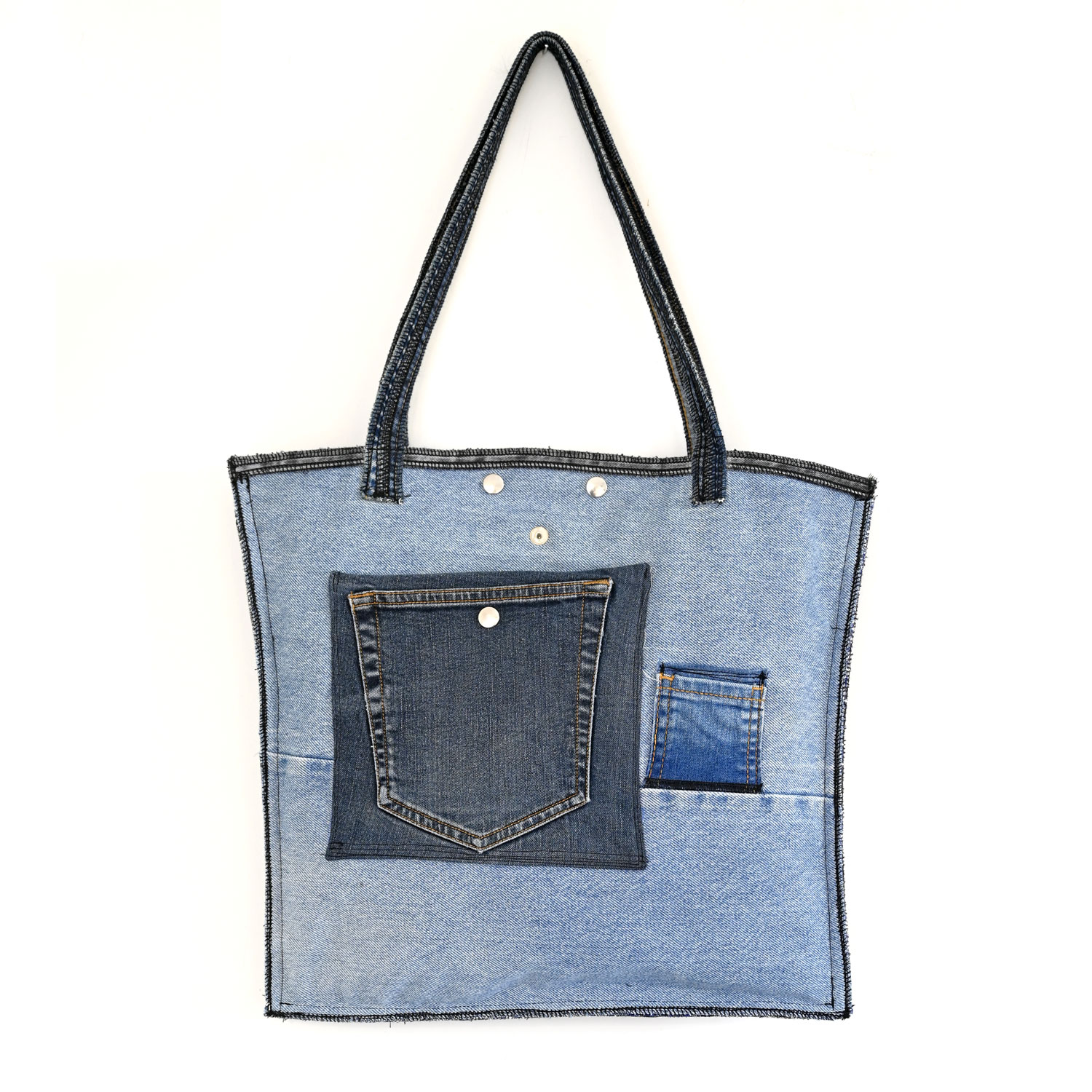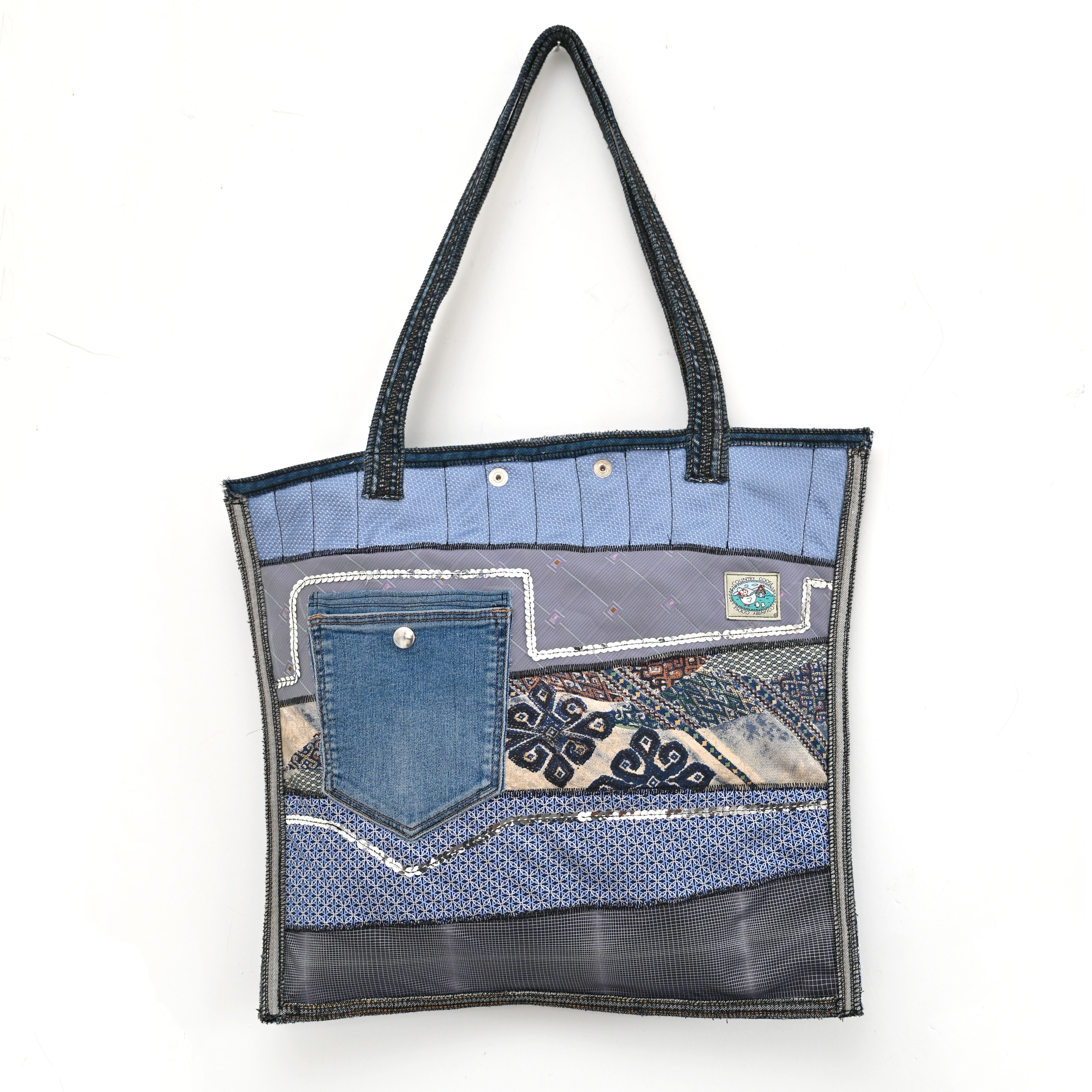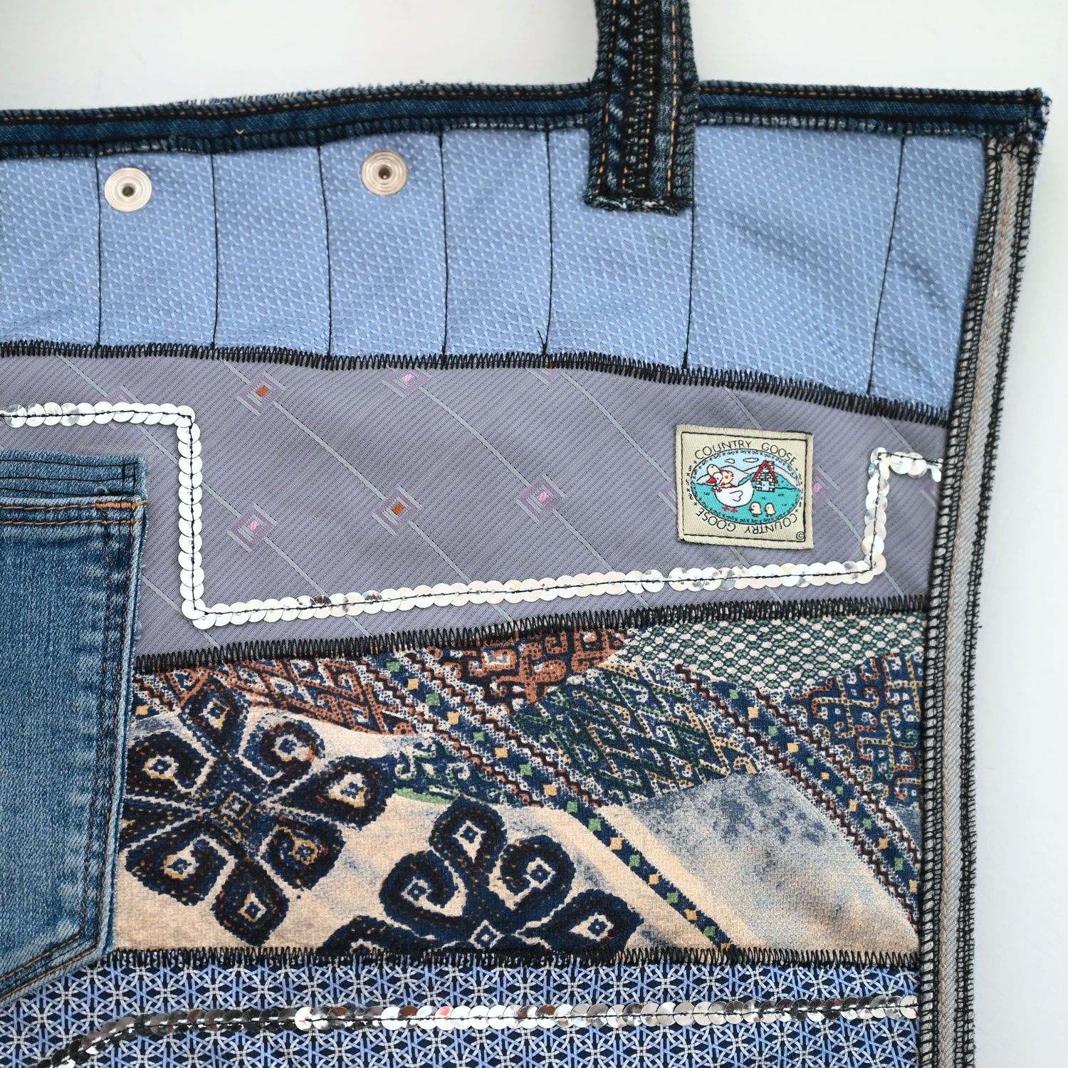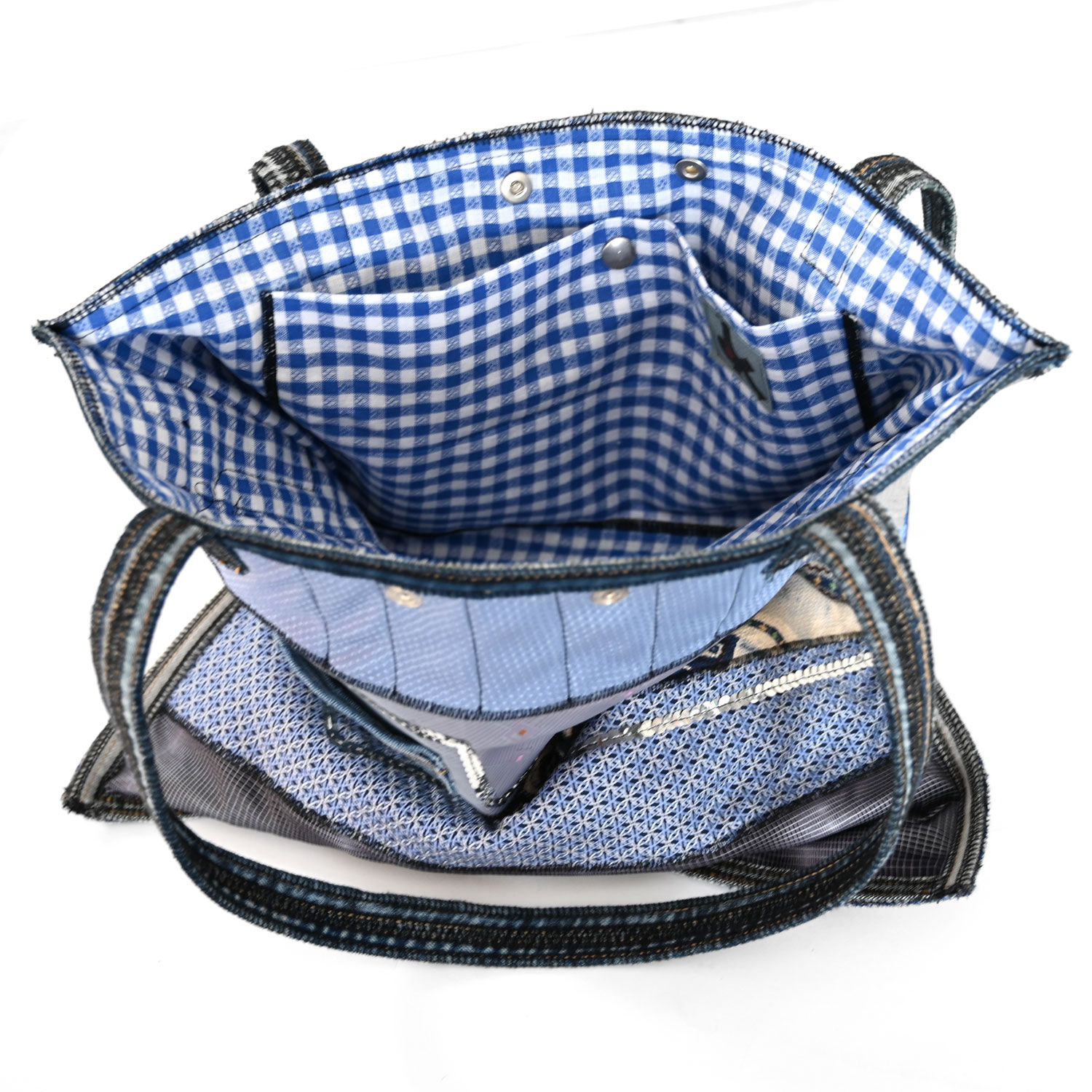 Velika torba od recikliranih kravata i džinsa, podstavljena, s tri vanjska i jednim unutarnjim džepom.