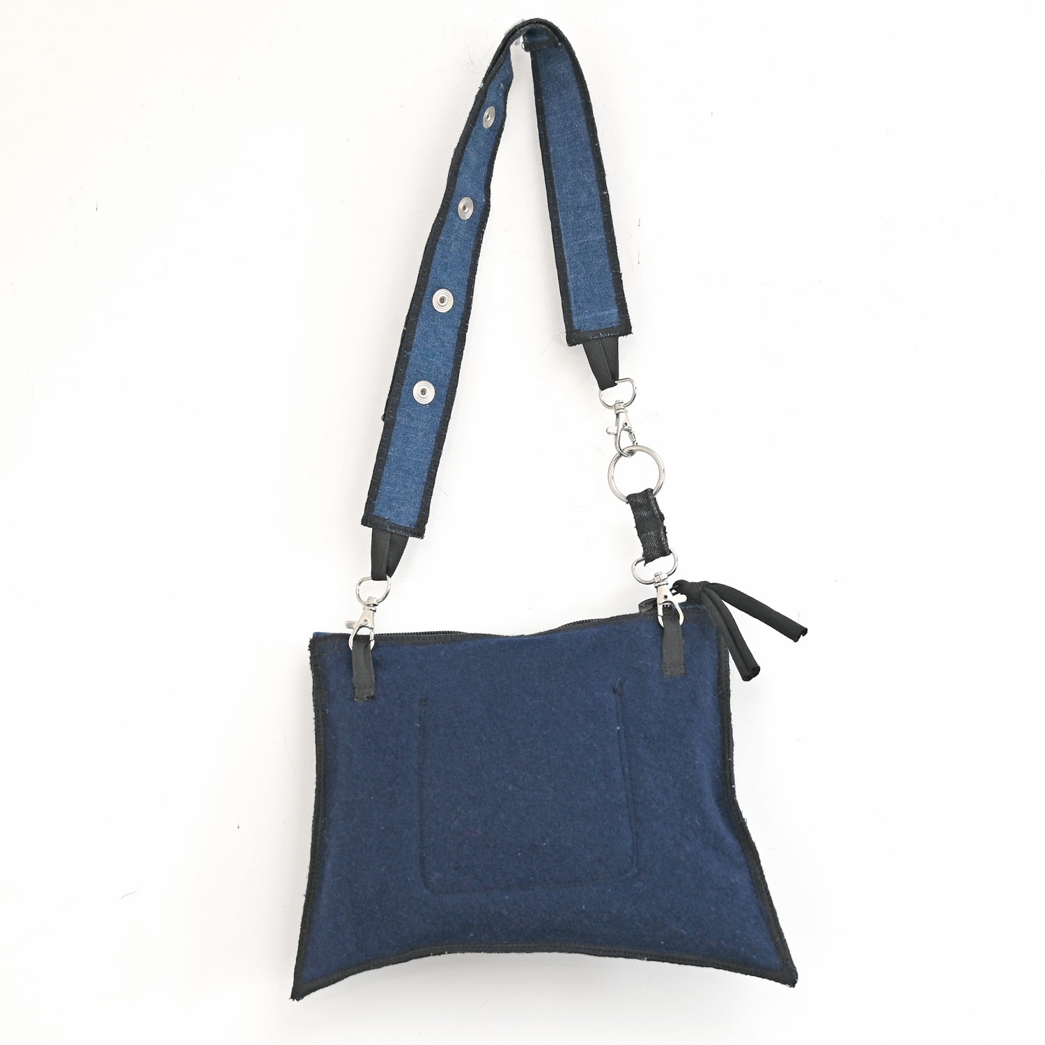 Torbica oko struka ili za na rame, od nadcikliranih kravata. Podstavljena, zatvaranje patentom. S unutarnjim džepićem.